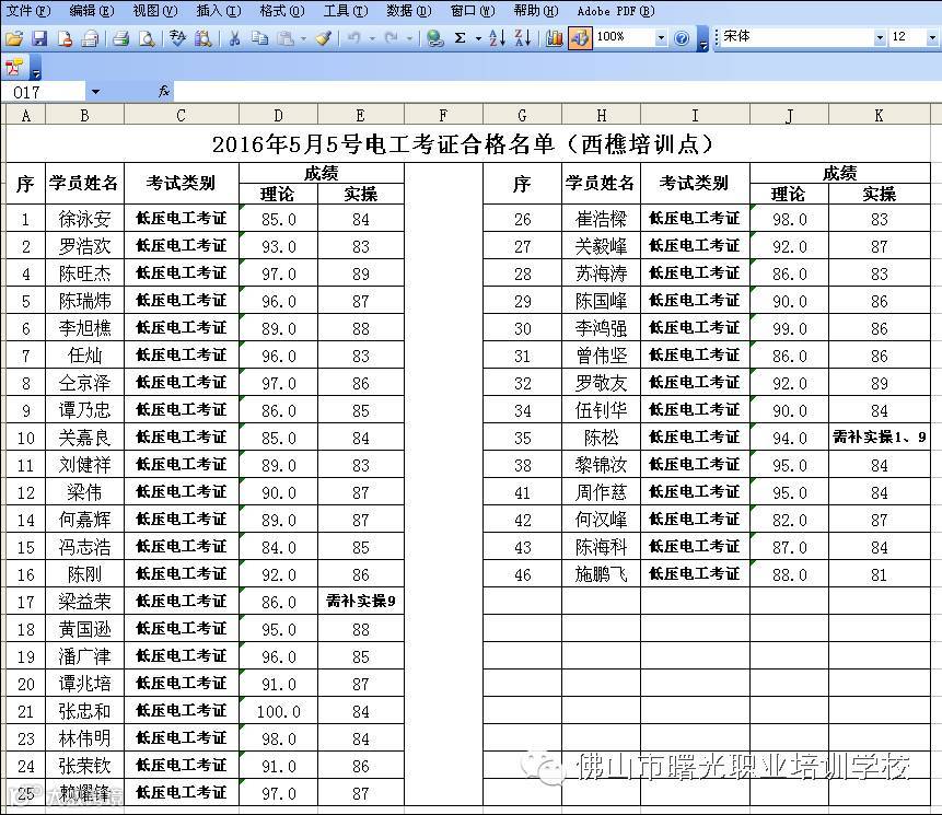 2016.5.5曙光学校电工考证合格名单 佛山市曙安安全技术服务公司