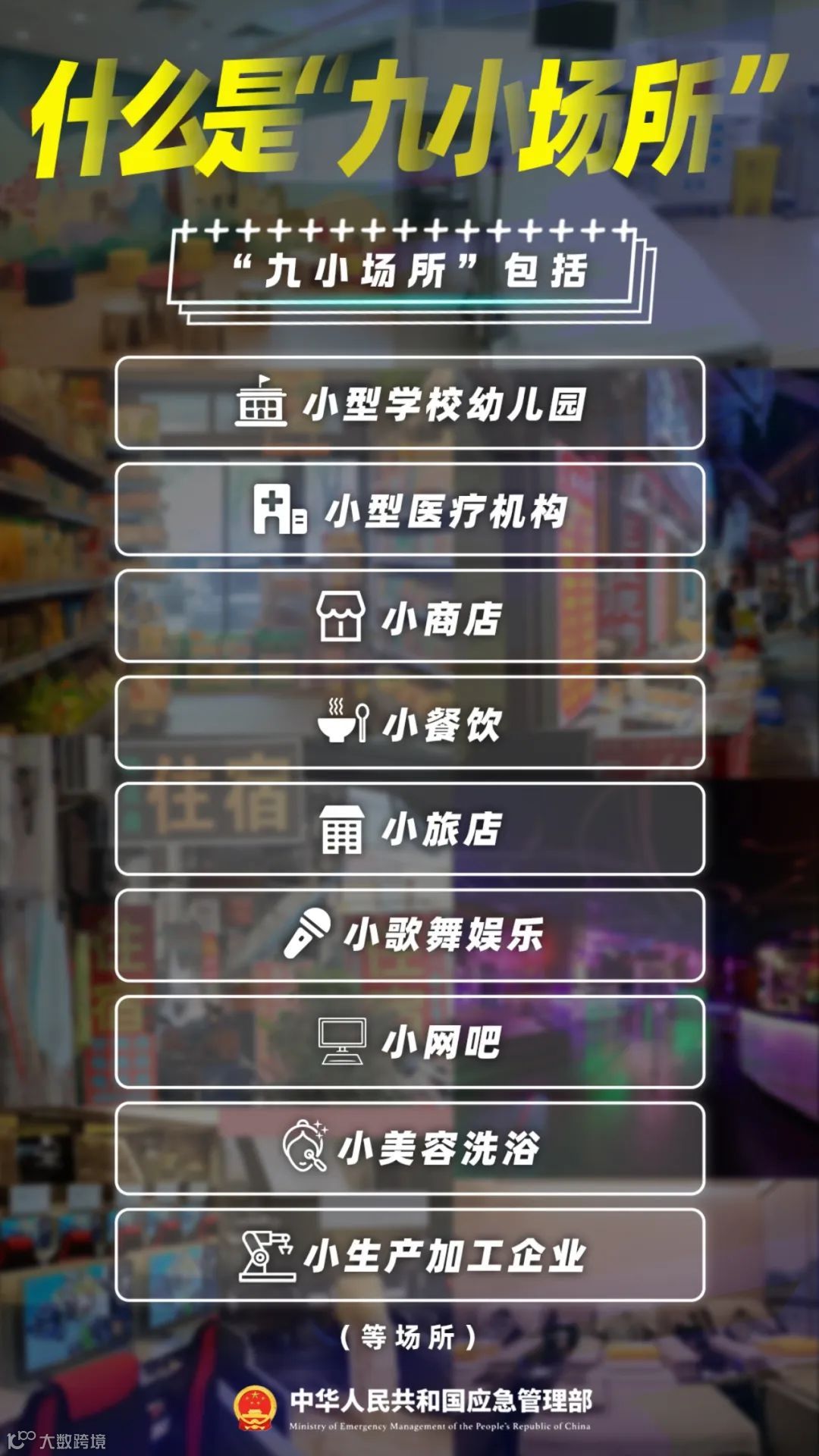 “九小场所”包括小型学校幼儿园、小型医疗机构、小商店、小餐饮、小旅店、小歌舞娱乐、小网吧、小美容洗浴、小生产加工企业等场所。