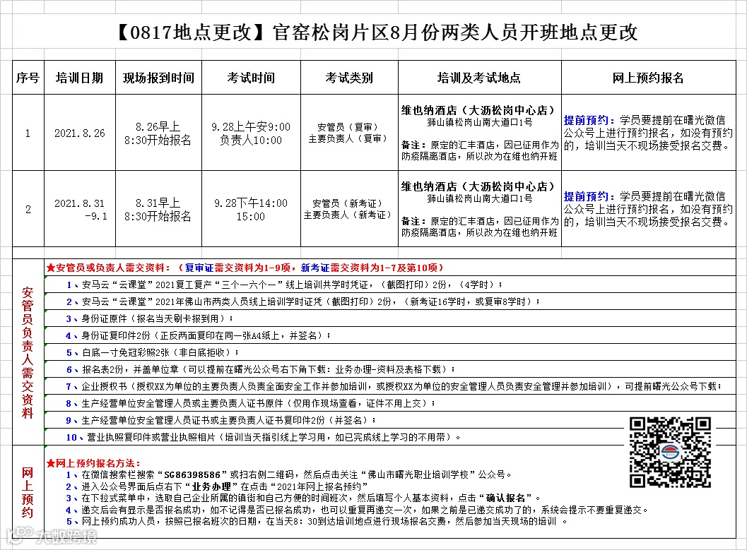 【0817地点更改】官窑松岗8月份两类人员开班地点更改通知 佛山市曙安安全技术服务公司