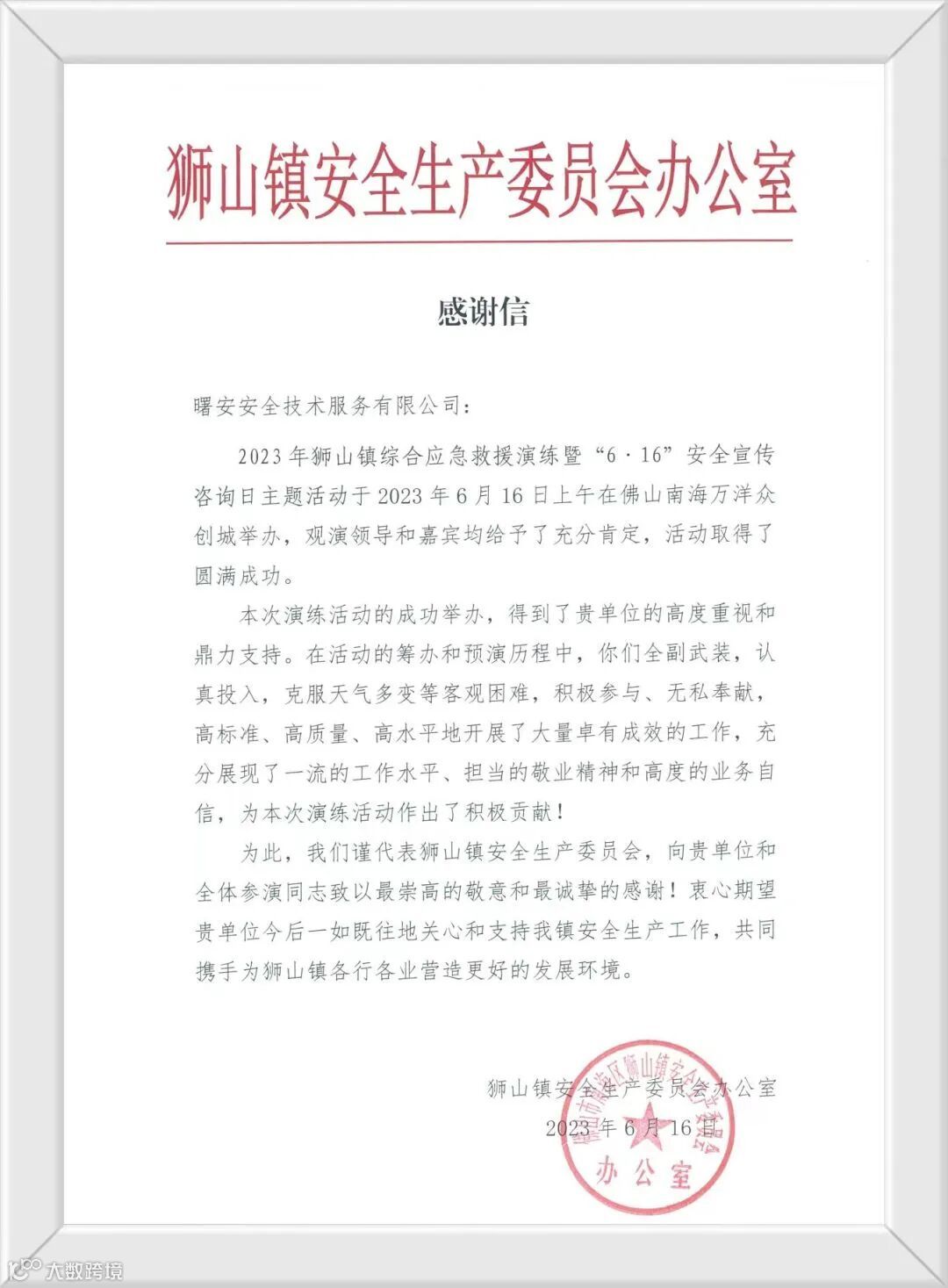 我司作为承办单位,一起参与和狮山镇2023年安全生产月的综合应急救援演练及安全生产宣传咨询活动,所做工作得到了上级部门的肯定。