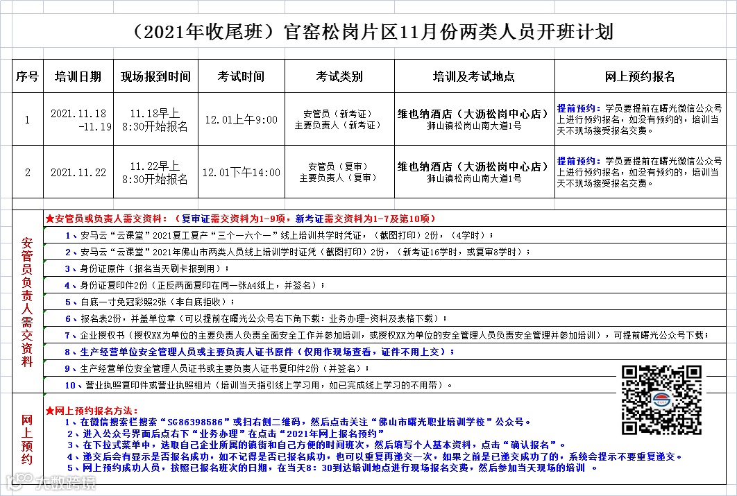 官窑松岗片区11月份收尾班的安管员、主要负责人开班如下表,开班地点为:松岗维也纳酒店(大沥松岗中心店),狮山镇松岗山南大道1号,请有需要的企业提前在曙光学校公众号上预约,然后在开班当天早上9点前去到现场报名交费培训。