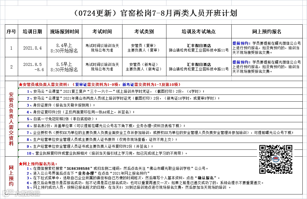 (0724更新)官窑松岗7-8月两类人员开班计划 佛山市曙安安全技术服务公司