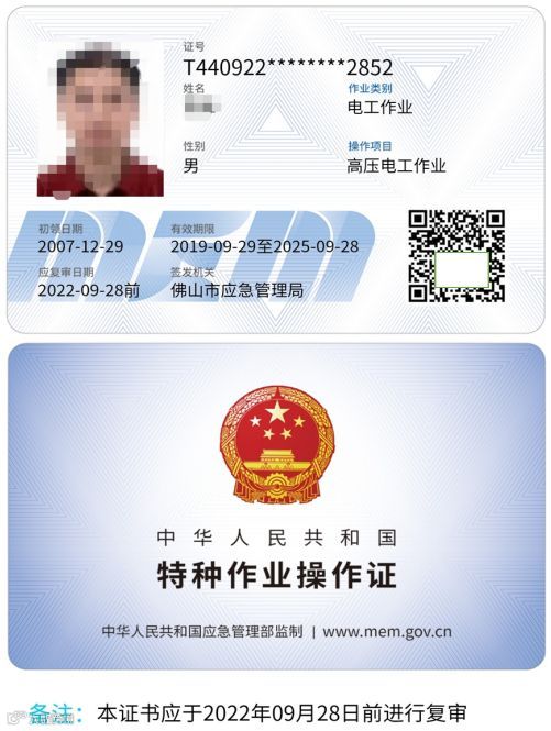2.特种作业操作证有效期为6年,在全国范围内有效,每3年复审1次,6年换证一次。佛山的特种作业操作证需要复审或换证的,应当在期满前60日内参加复审。
