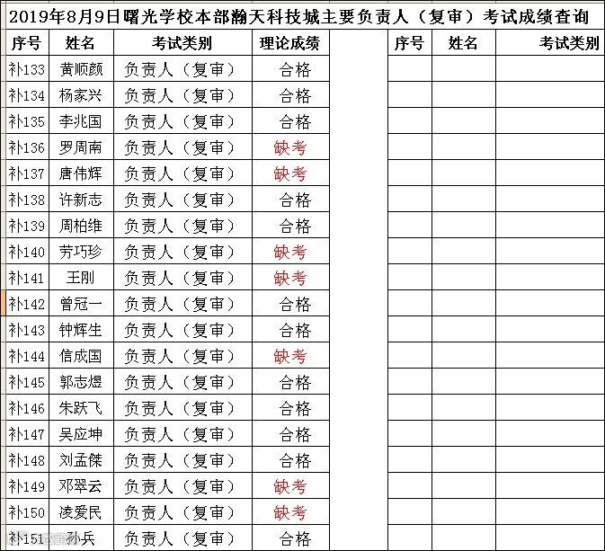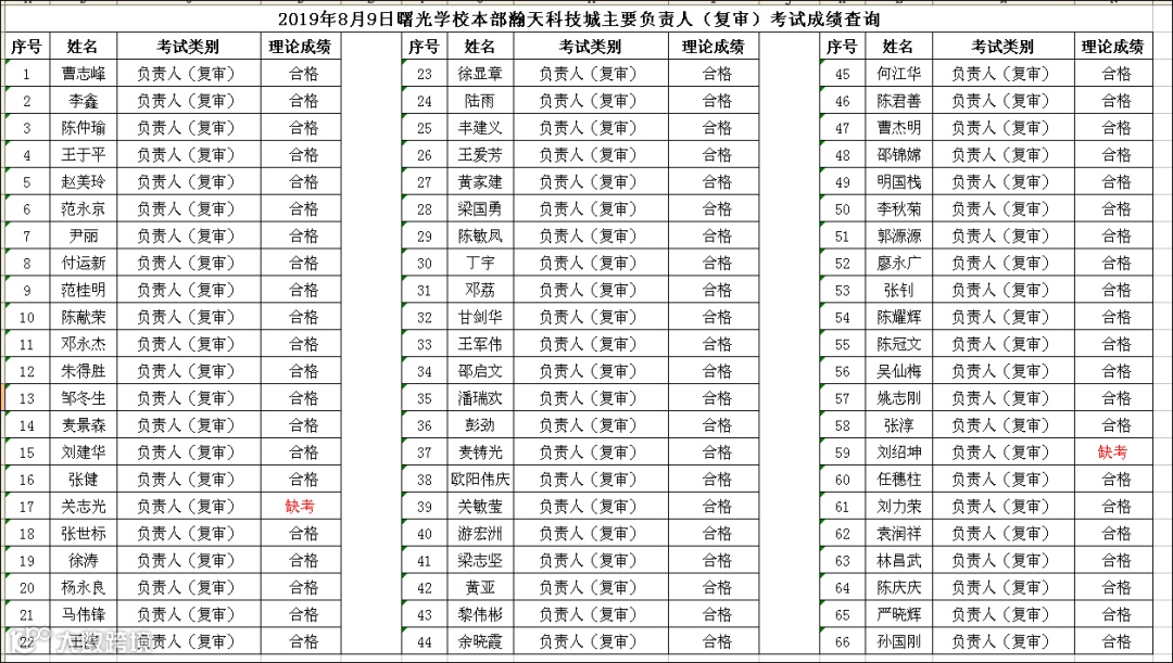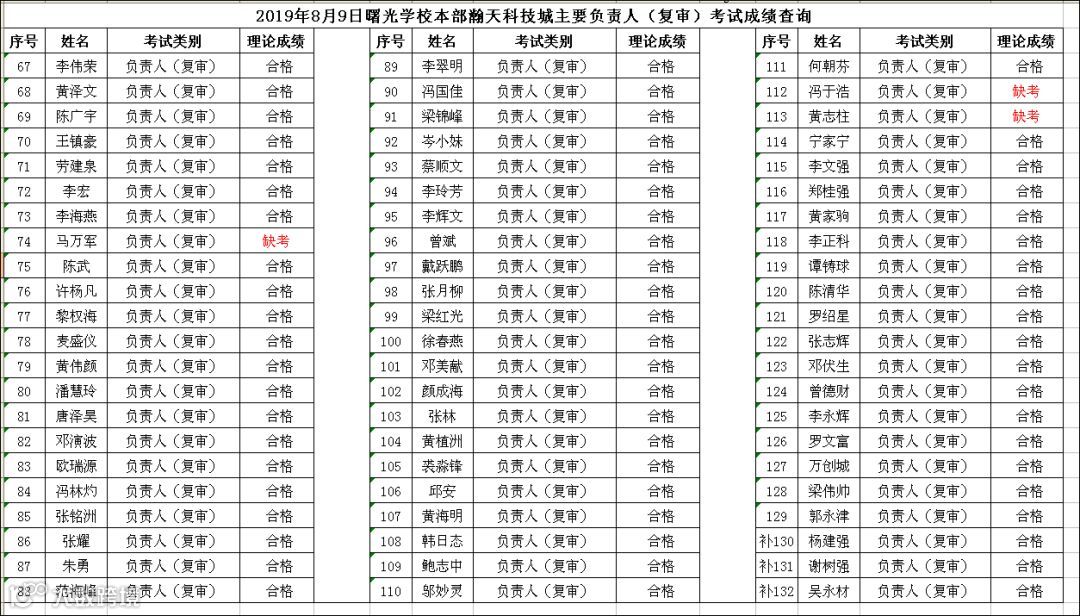 2019.08.09曙光学校本部瀚天科技城主要负责人(复审)考试成绩查询