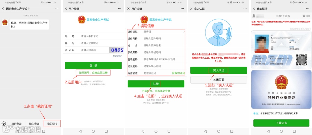 使用微信公众号(国家安全生产考试)获取电子证书时,必须关注公众号(国家安全生产考试),通过“我的证书”进行用户注册和实人认证后,才可获取电子证书。凡是在公众号中没有进行用户注册和实人认证即可获取电子证书的,该公众号均为假冒微信公众号。
