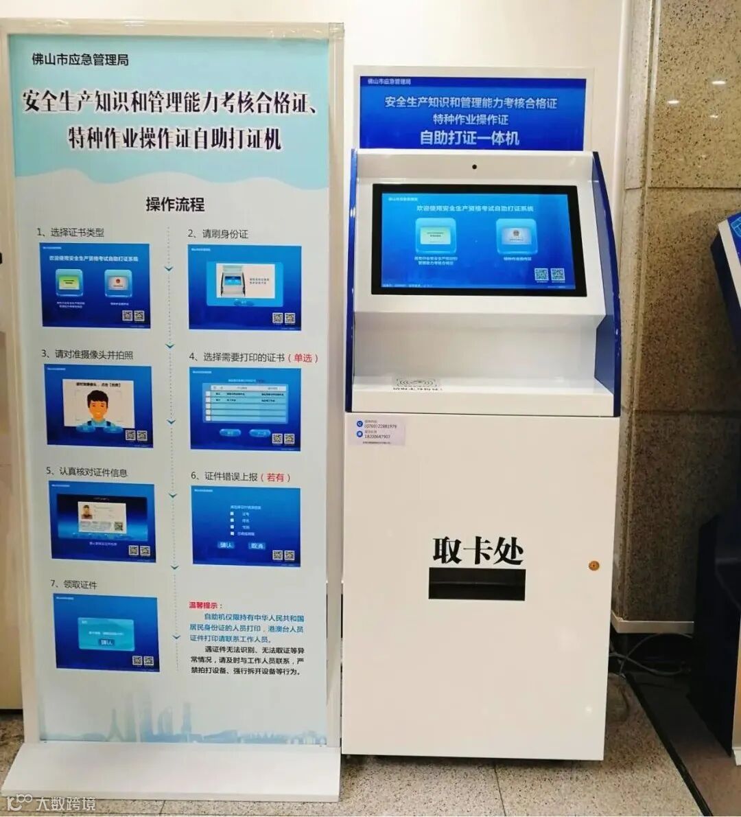 为了提供更便捷高效的制证取证服务,从4月7日起,市应急管理局在佛山市行政服务中心投入了全市第一台高危行业安全生产知识和管理能力考核合格证和特种作业人员操作证的自助制证一体机,市民只需1分钟即可完成证件自助打印。