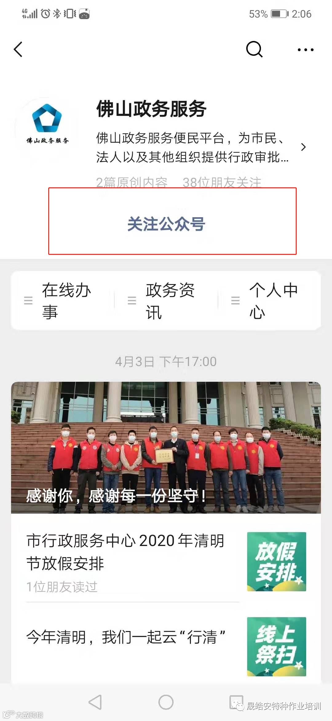 点击“佛山政务服务”公众号,然后点击“关注公众号”