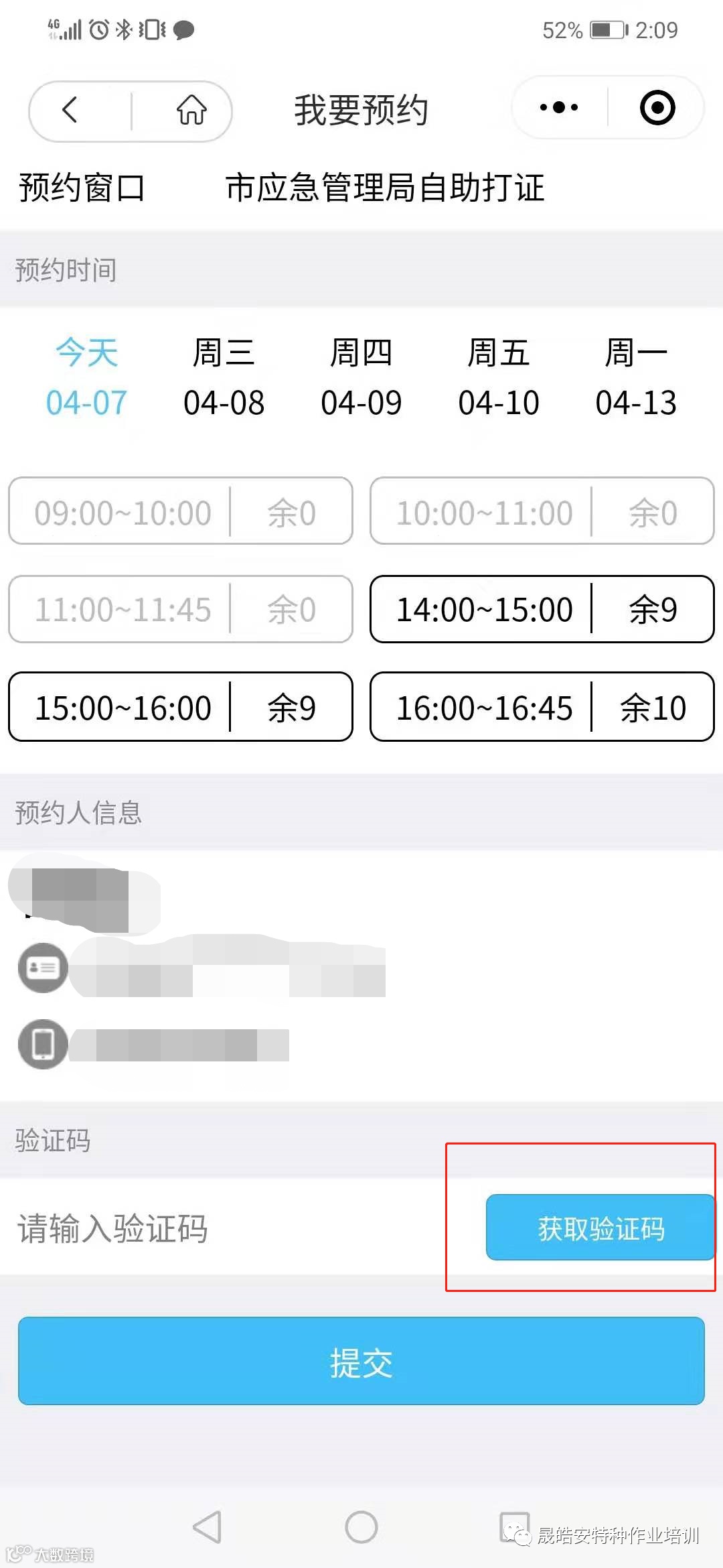 最后选择“预约时间”,再点击“获取验证码”,输入验证码后,点击“提交”