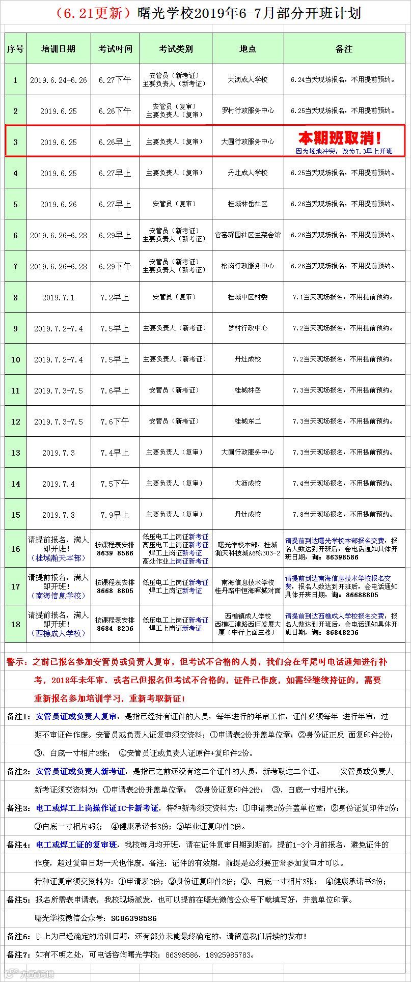 另外,原定于6.25在大圃开办的主要负责人复审班,因为场地临时有其他安排无法协调原因,需要改期,改为7月3号开班,在7月3号开班当天早上8:30到达现场直接报名即可,请互相知悉,造成不便,敬请谅解: