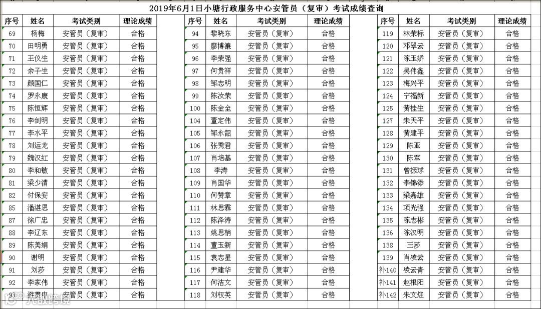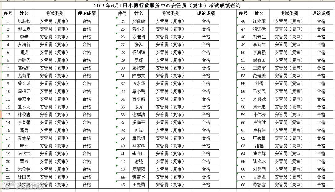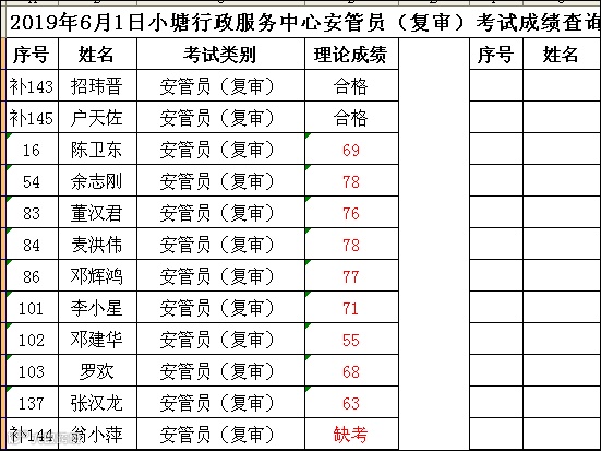 2019.06.01小塘行政服务中心安管员(复审)考试成绩查询