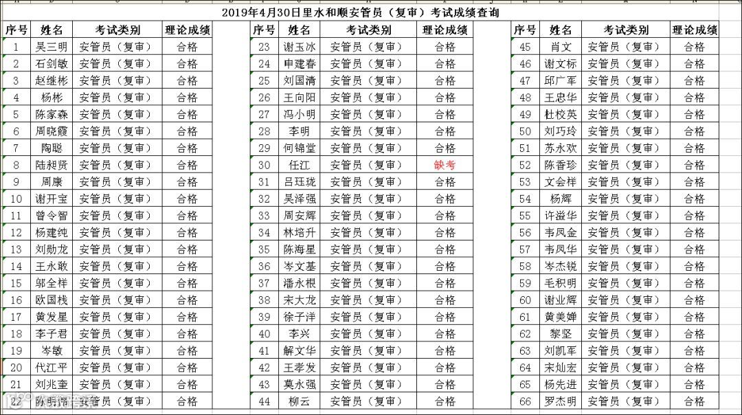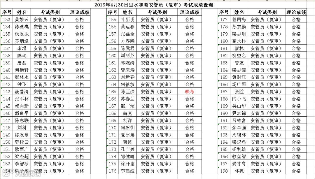 2019.04.30里水和顺安管员(复审)考试成绩查询