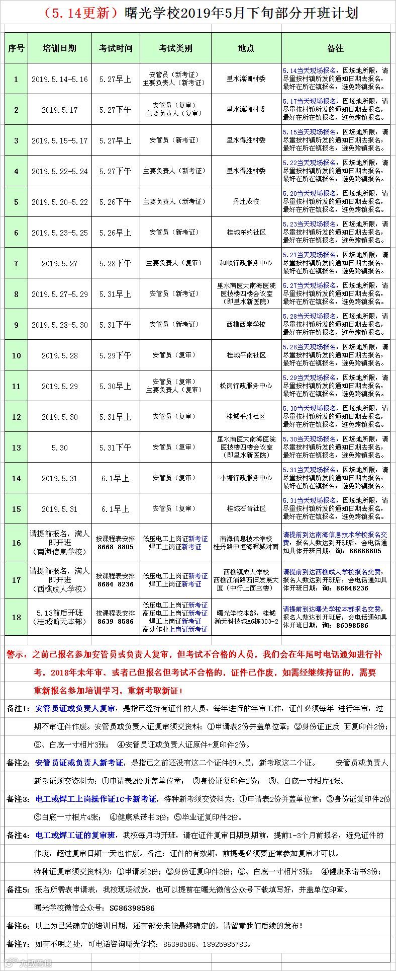 (5.14更新)2019年5月下旬曙光部分开班计划 佛山市曙安安全技术服务公司