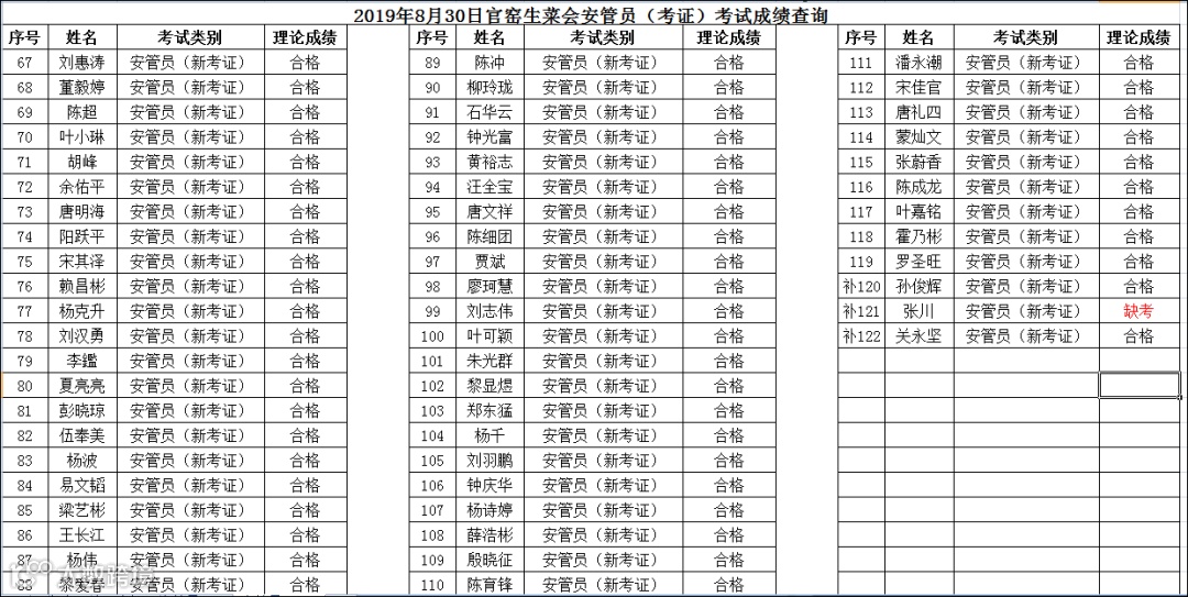 2019.08.30官窑生菜会馆安管员(考证)考试成绩查询