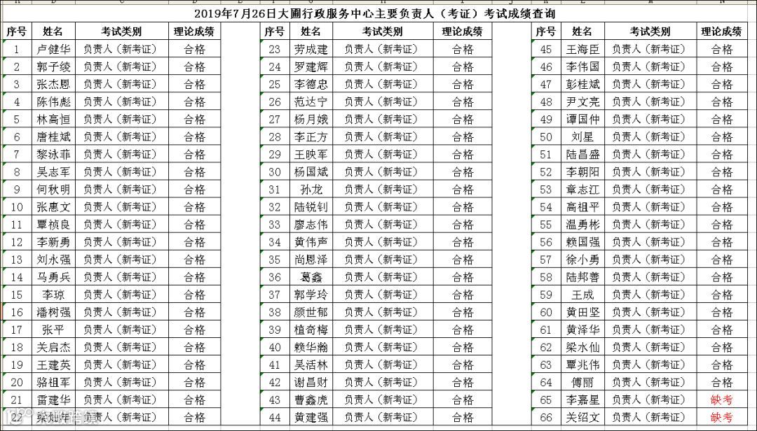 2019.07.26大圃行政服务中心主要负责人(考证)考试成绩查询
