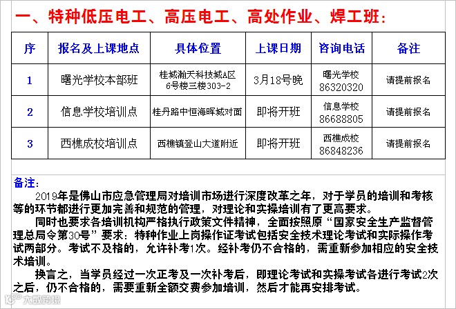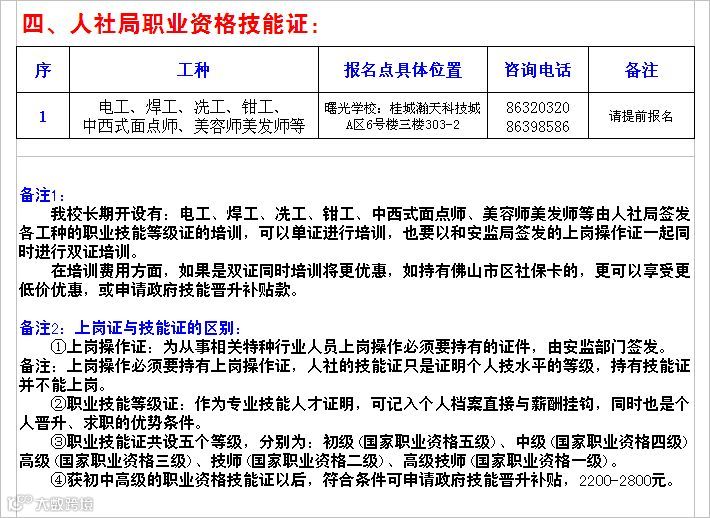 在我们曙光学校本部、以及在南海信息学校和西樵成校的报名培训点,各个工种的培训及考证均已接受大家的咨询和报名,欢迎大家就近报名: