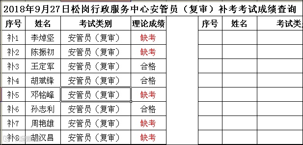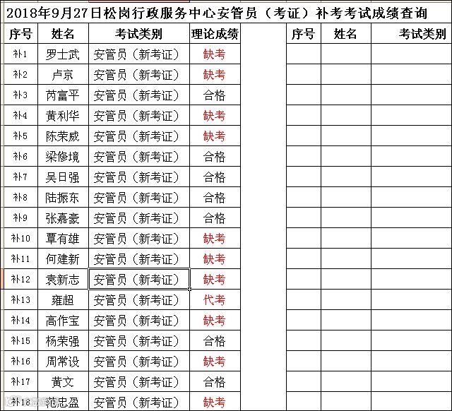 2018.09.27松岗行政服务中心安管员(复审)考试成绩查询