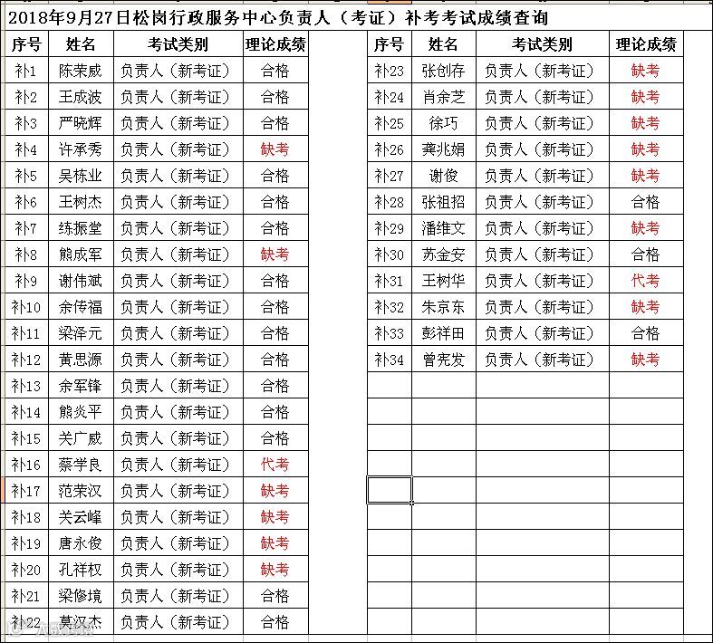 2018.09.27松岗行政服务中心负责人(考证)考试成绩查询