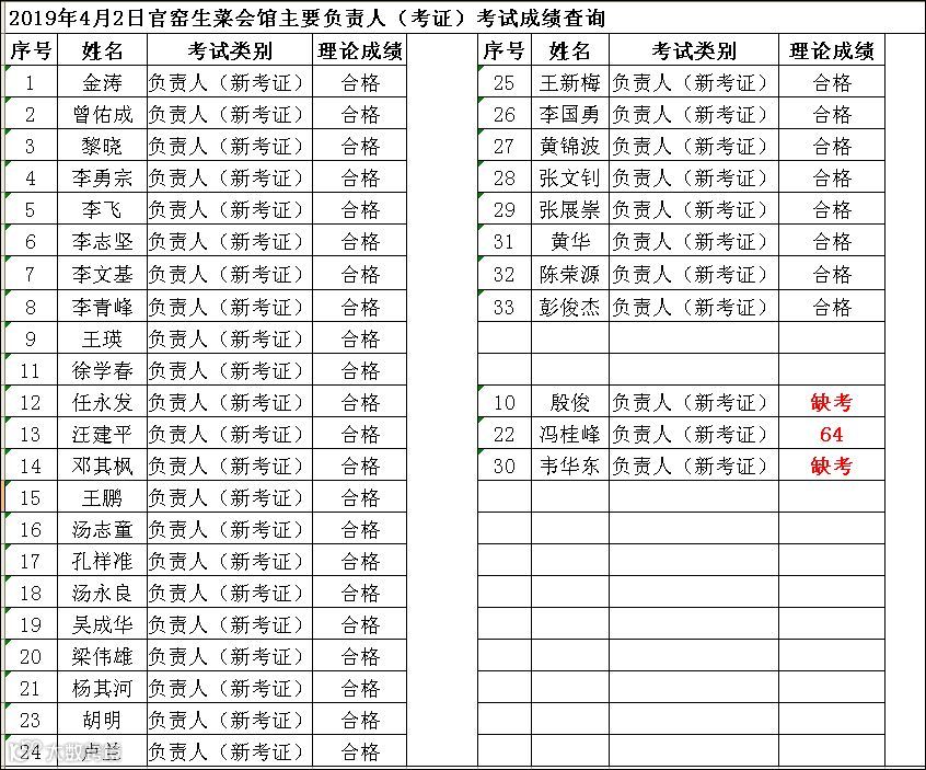 2019.04.02官窑生菜会馆主要负责人(考证)考试成绩查询