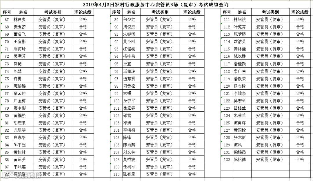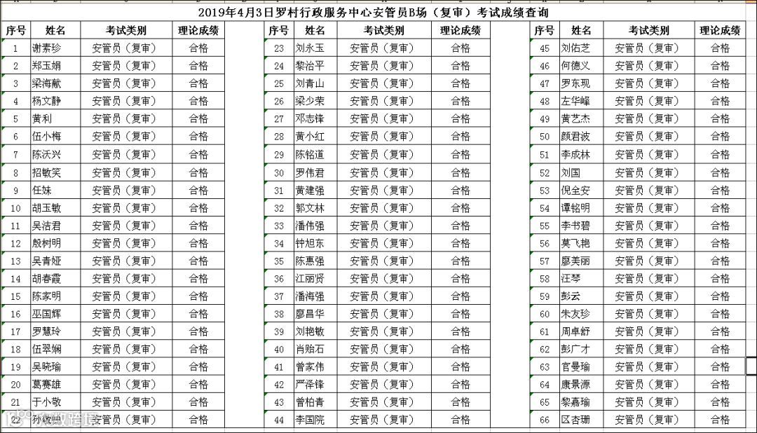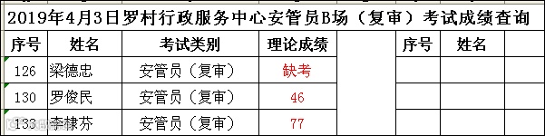 2019.04.03罗村行政服务中心安管员(复审)(10:30考试)成绩查询