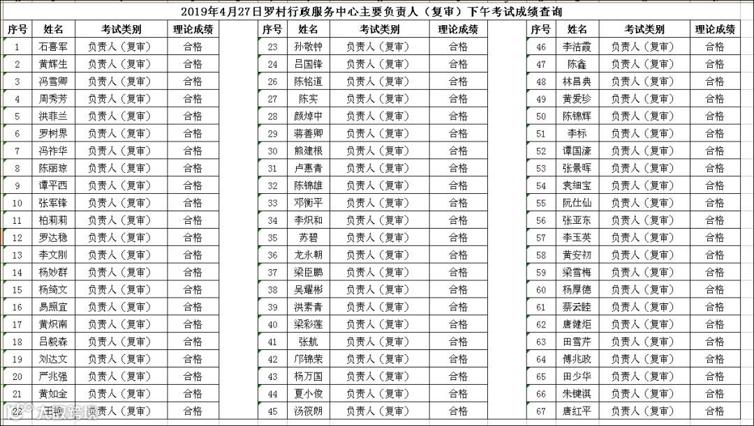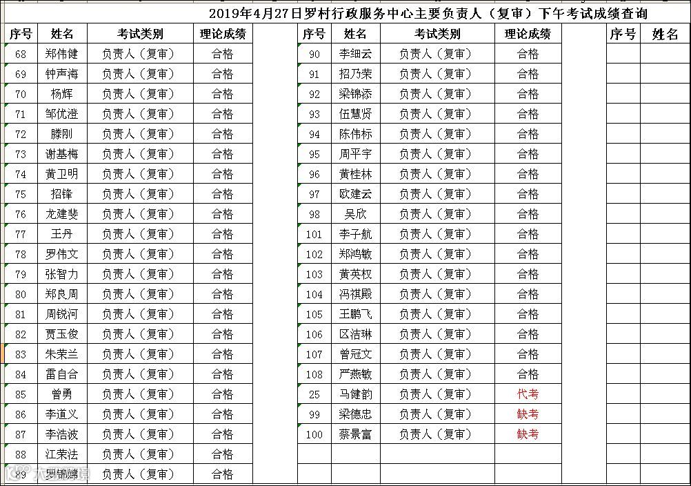 (下午场)2019.04.27罗村行政服务中心主要负责人(复审)成绩查询