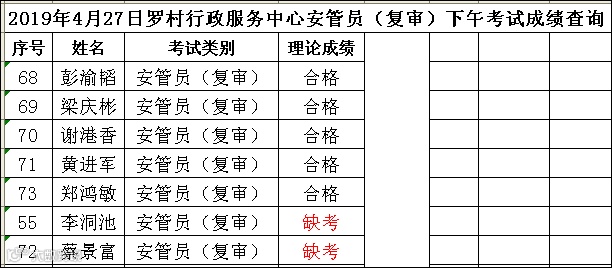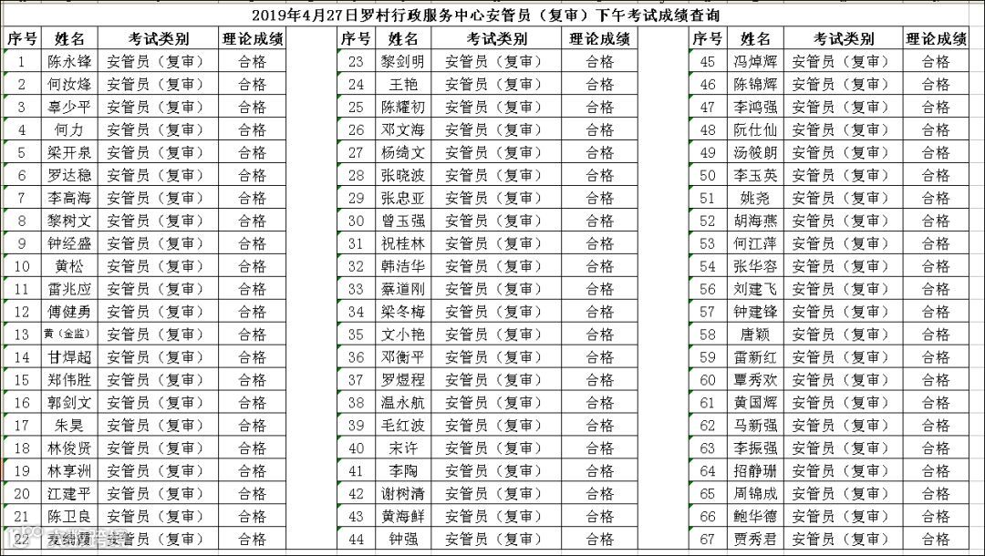 (下午场)2019.04.27罗村行政服务中心安管员(复审)成绩查询