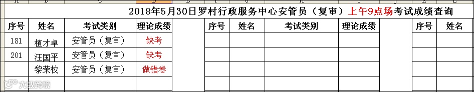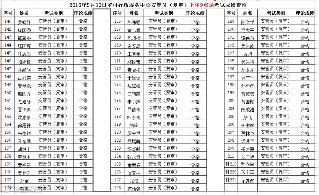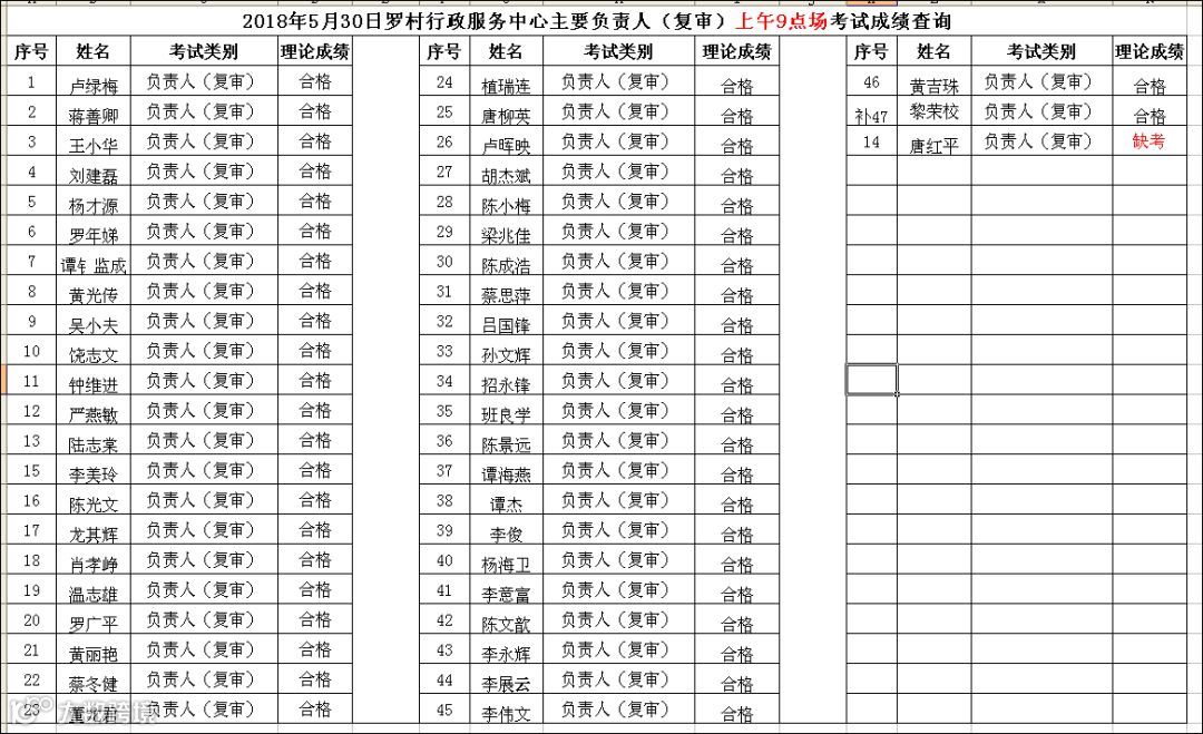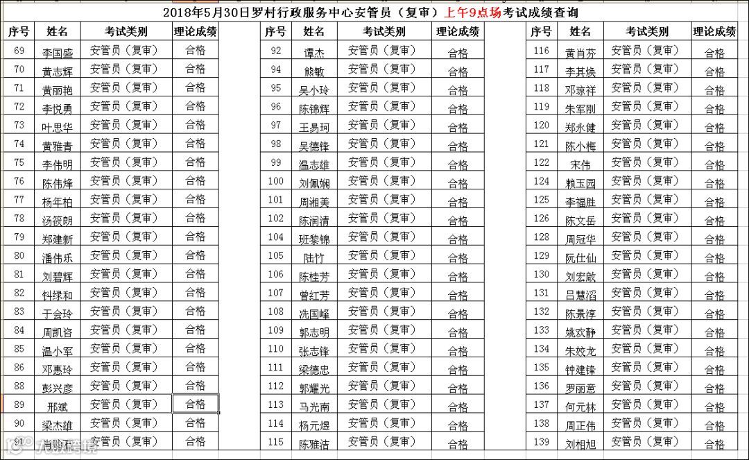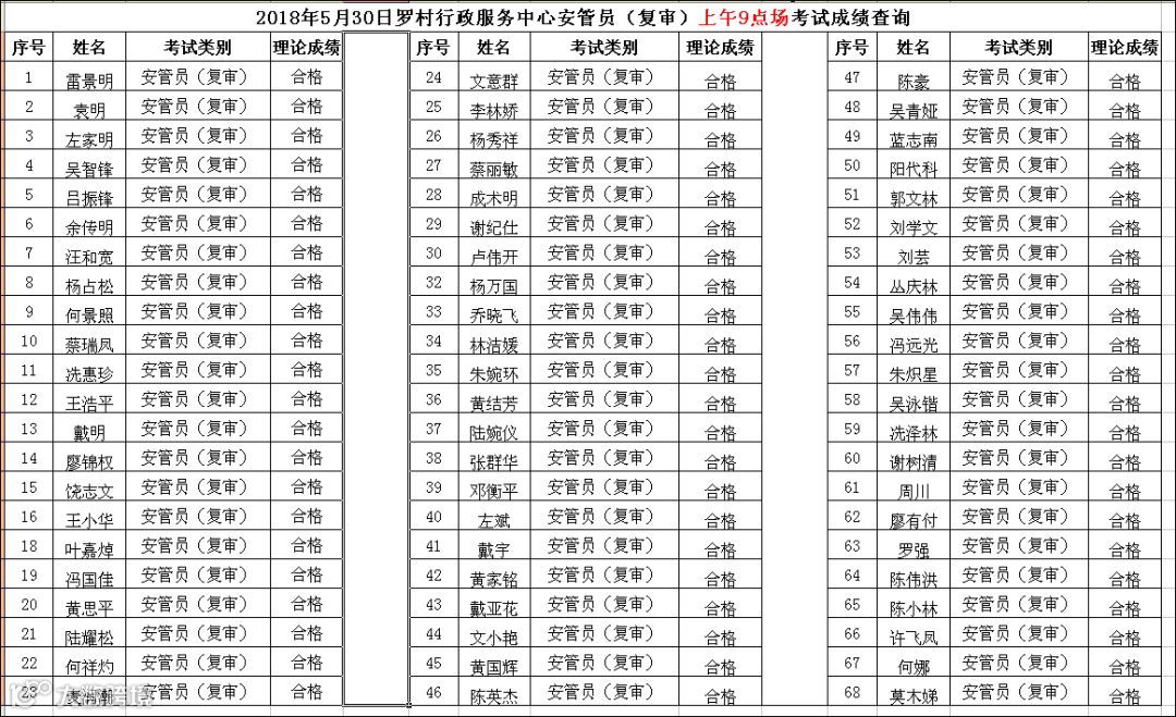 2018.05.30罗村行政服务中心安管员(复审)+负责人(复审)上午9点场考试成绩查询