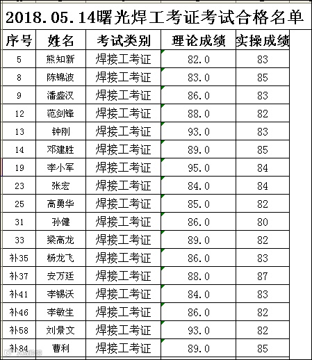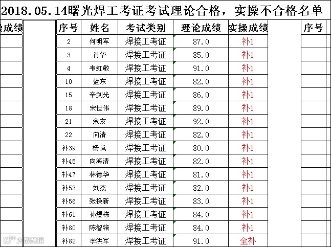2018.05.14曙光焊工(考证)考试理论合格,实操不合格名单