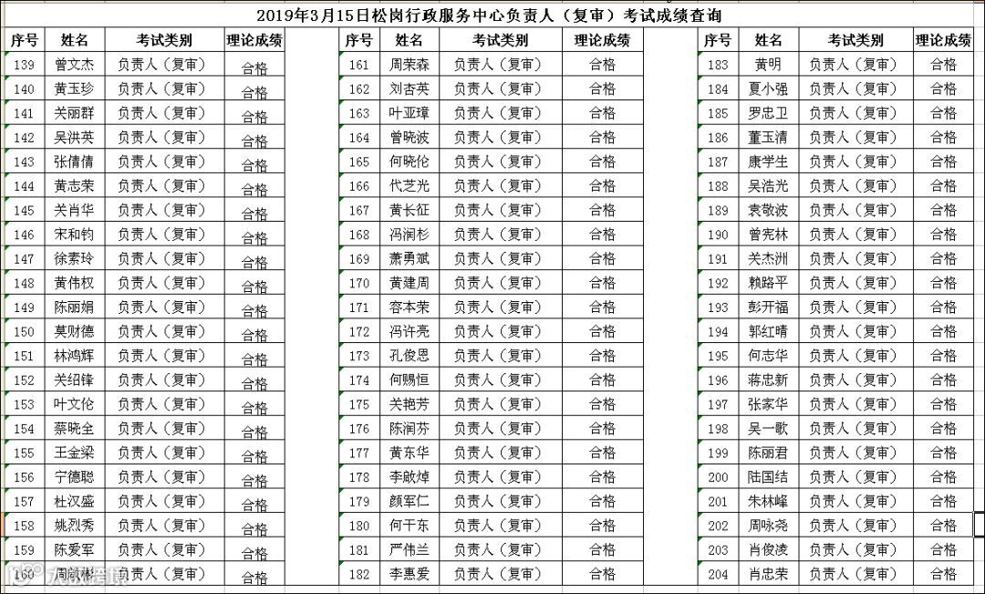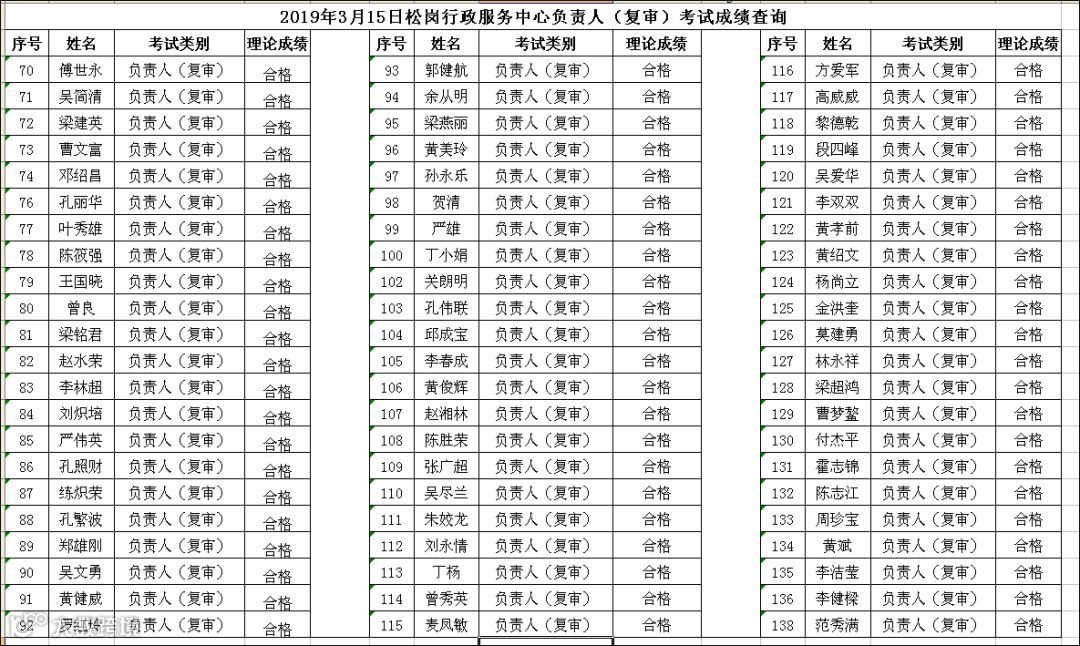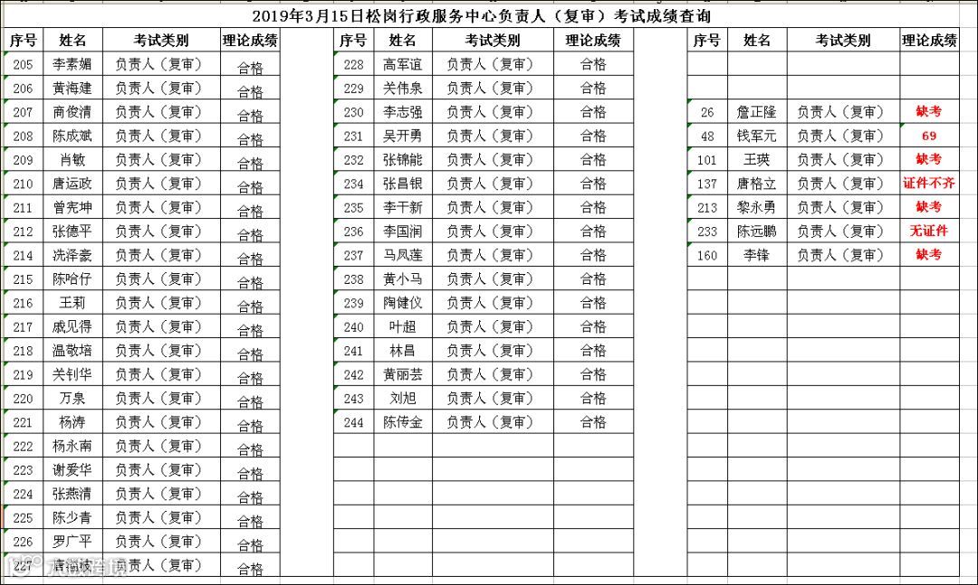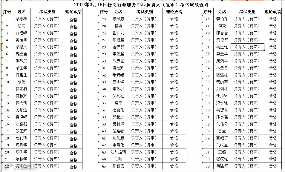 2019.03.15松岗行政服务中心主要负责人(复审)考试成绩公布
