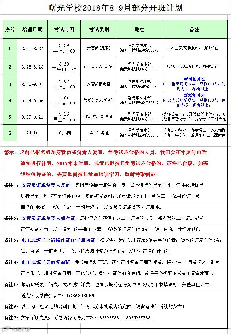 上半年有部分厂企或个人因为某些原因,未能参加各培训考证的需求,为满足这部分厂企及学员的需求,现我校安排增开以下安管员和负责人新考证班,具体日期见下表。
