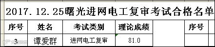 2017.12.25曙光进网电工(复审)考试合格名单