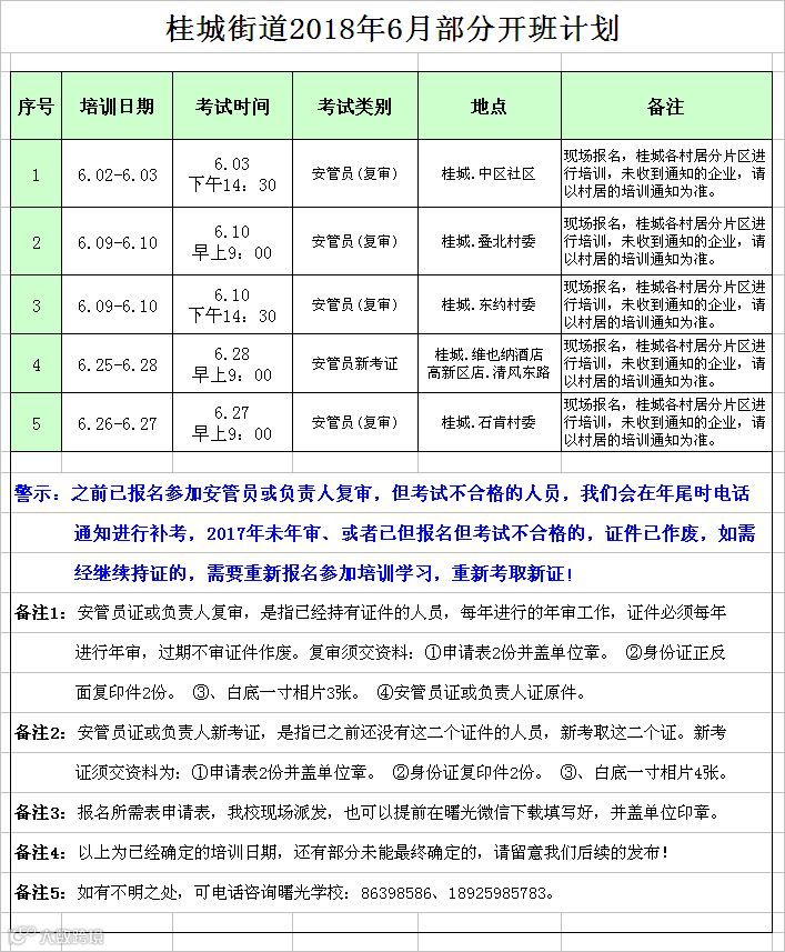 桂城片区6月安管员/负责人份开班计划 佛山市曙安安全技术服务公司