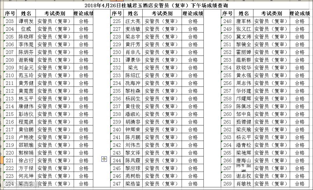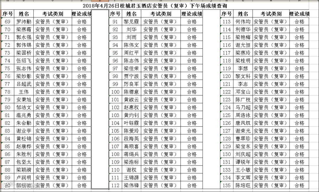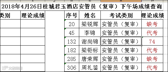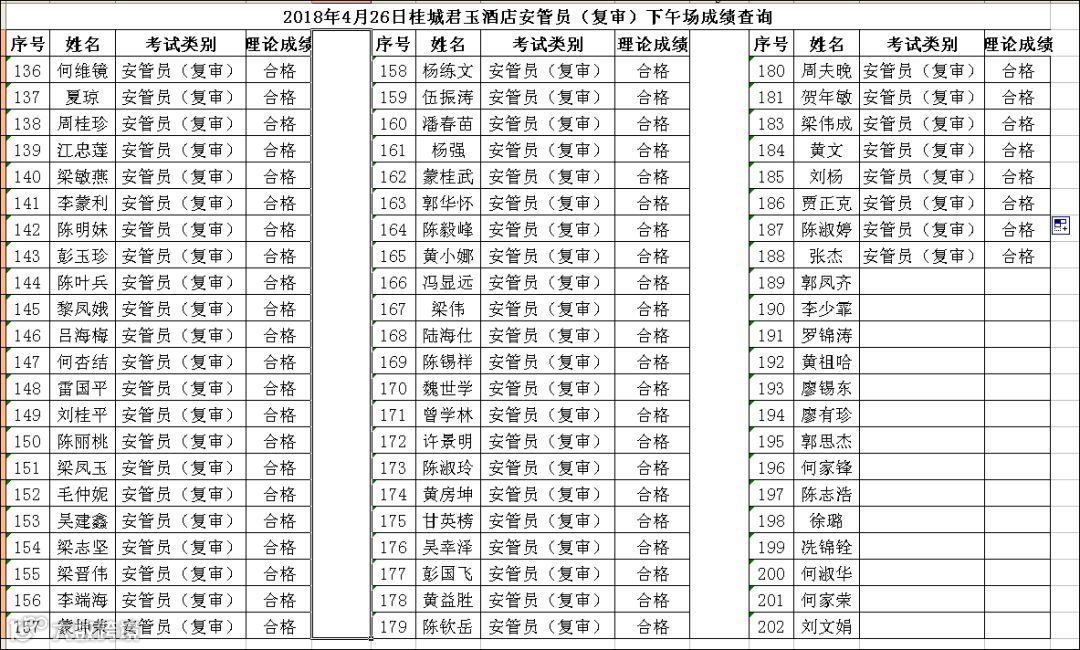 2018.04.26桂城君玉酒店安管员(复审)下午场考试成绩查询