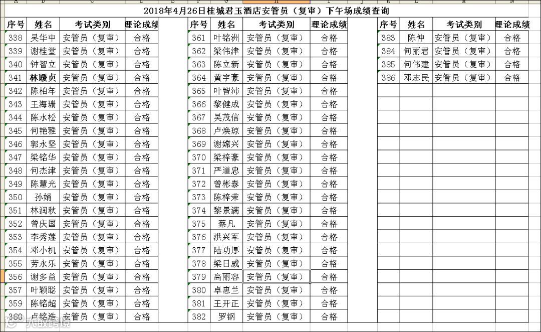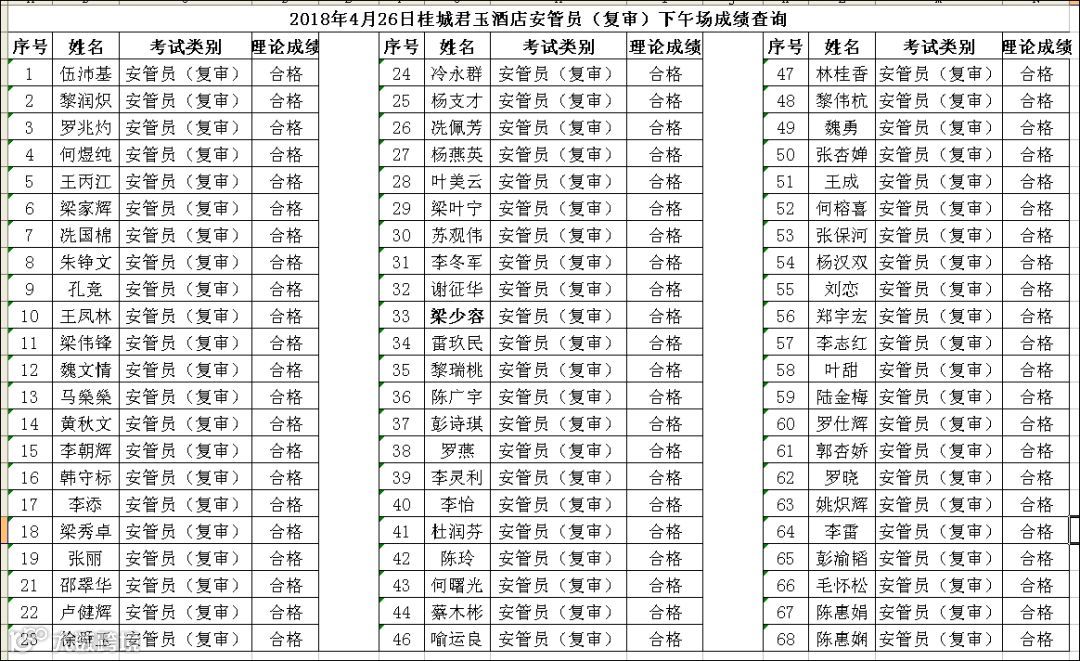 导读:2018.04.26桂城君玉酒店安管员(复审)下午场考试成绩查询