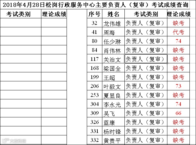 2018.04.28松岗行政服务中心主要负责人(复审)考试成绩查询