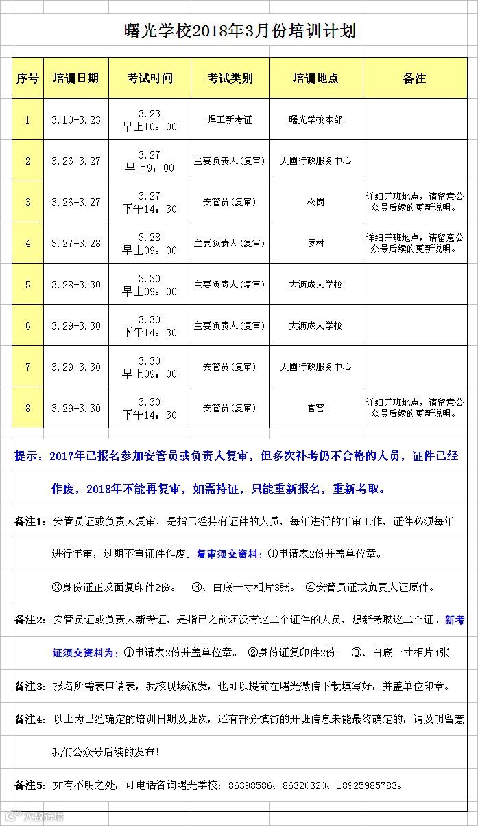 以下为已经确定的培训日期及班次,还有部分镇街的开班信息未能最终确定的,请及明留意我们公众号后续的发布!也可向单位所在村居或安监部门咨询、或致电我校进行咨询:86398586、86320320。