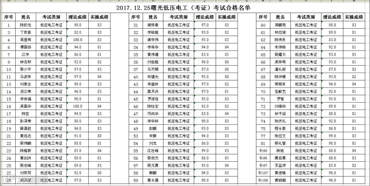 2017.12.25曙光低压电工(考证)考试合格名单