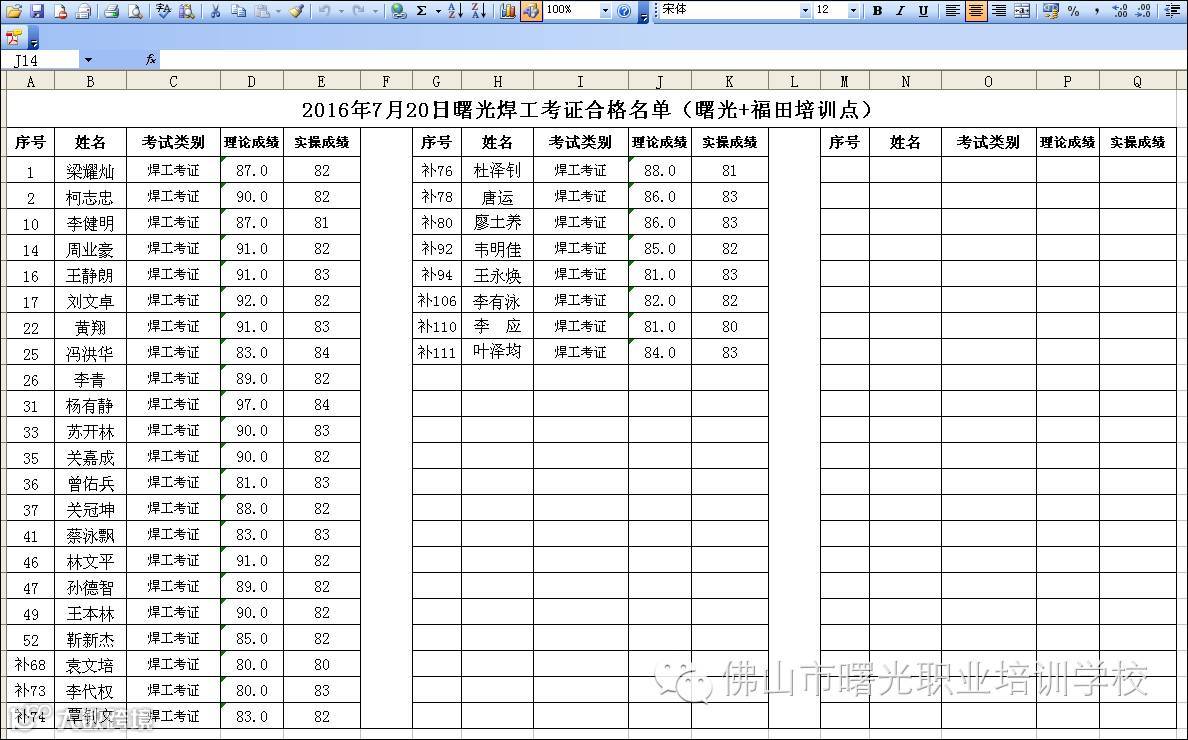 2016.7.20曙光学校焊工考证合格名单 佛山市曙安安全技术服务公司