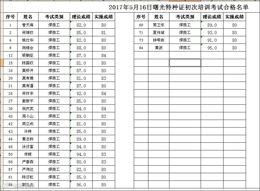 2017.05.16曙光焊工新考证(2)考试合格名单 佛山市曙安安全技术服务公司