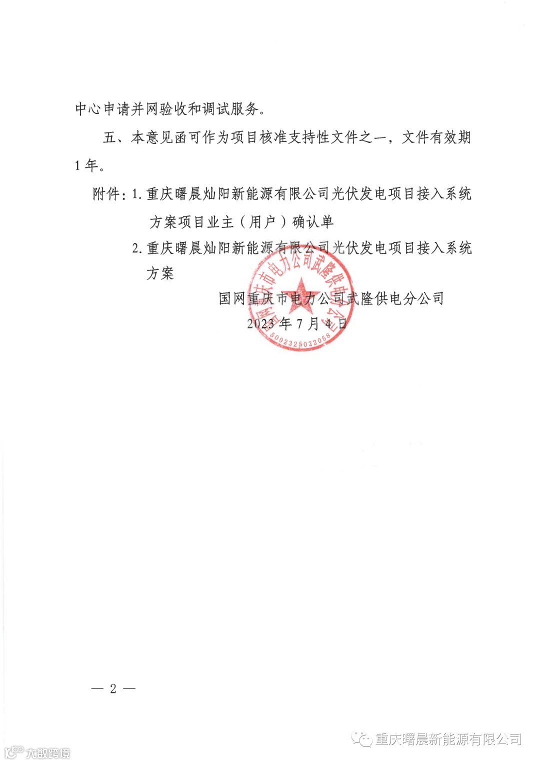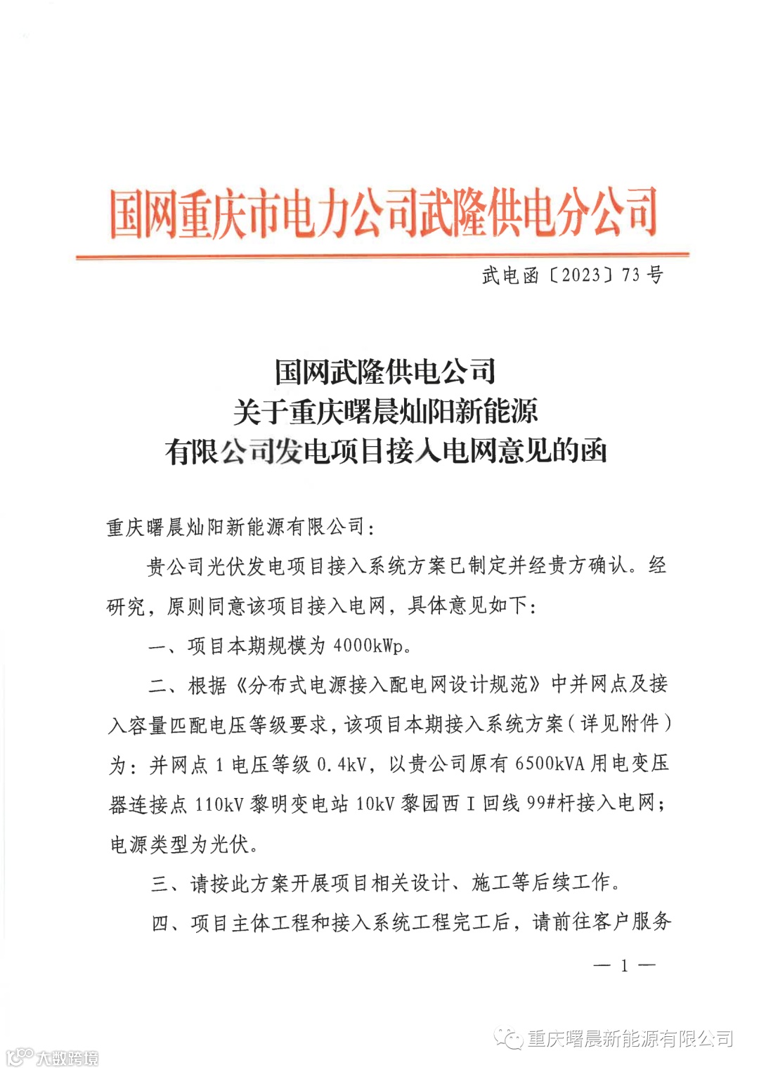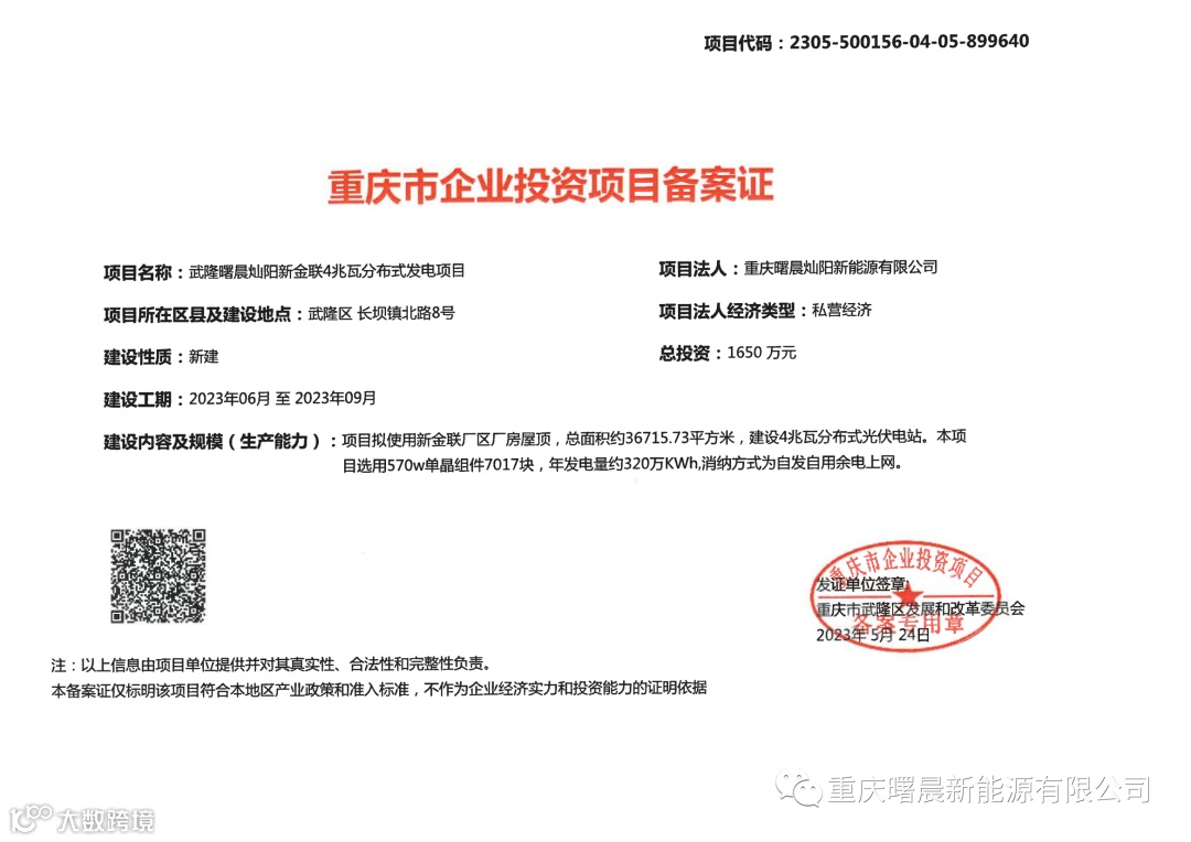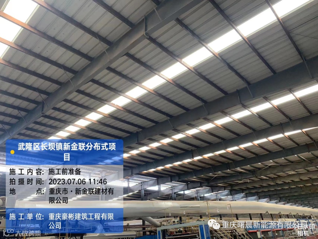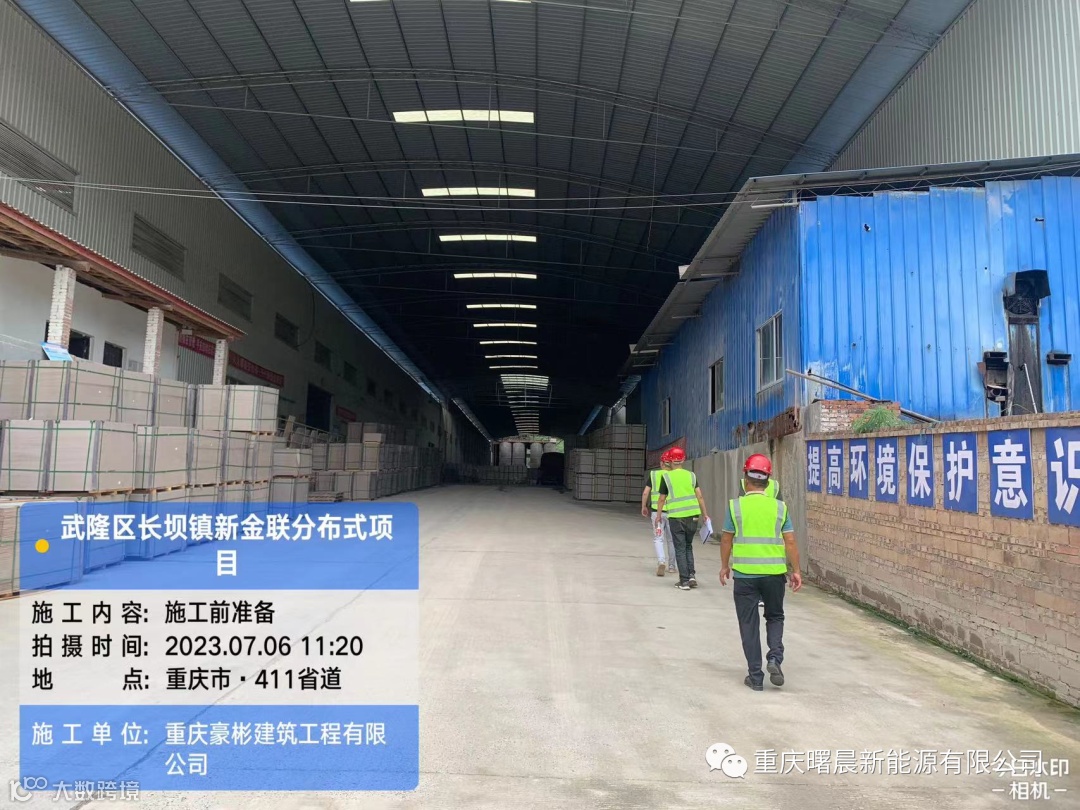 截止目前武隆曙晨灿阳新金联4兆瓦屋顶光伏发电项目已取得发改委核准文件及电力接入的批复。项目已满足开工条件,7月5日公司工程部对新金联厂房进行施工前的检查,为接下来的进场施工做好充分准备。
