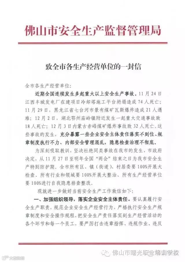 现就进一步做好当前安全生产工作致信如下: