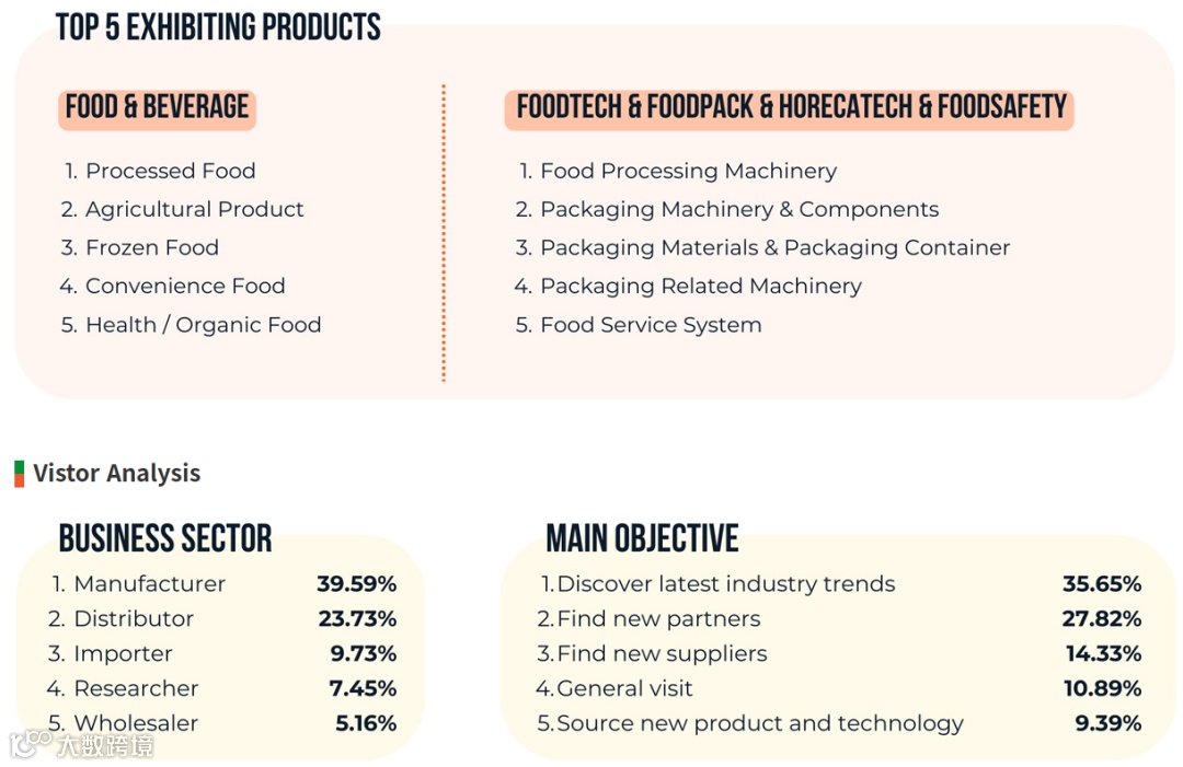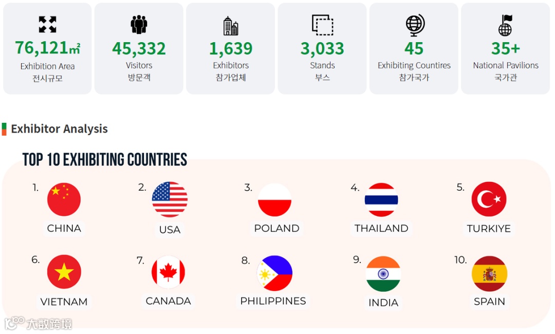 2025年第42届韩国首尔国际食品展(Seoul Food)在韩国首尔举办,展出面积 76000平米,来自45个国家的参展商数量及参展品牌达到1639家,专业观众约45332人,其中韩国企业469 家,国际展区企业 658家,732个展位。