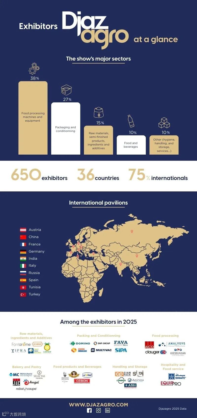 作为北非地区规模最大、影响力最强的食品加工类展览会,DJAZAGRO由法国头部展览公司爱博集团(Comexposium)主办,隶属于享誉全球的SIAL系列展。展会以严格的专业定位著称,仅向注册专业人士开放,确保高质量的观展与洽谈环境。阿尔及利亚食品饮料展——北非食品展(DJAZAGRO)由此吸引了大量追求创新产品与解决方案的高级别买家,已成为食品企业进入北非市场的战略入口。