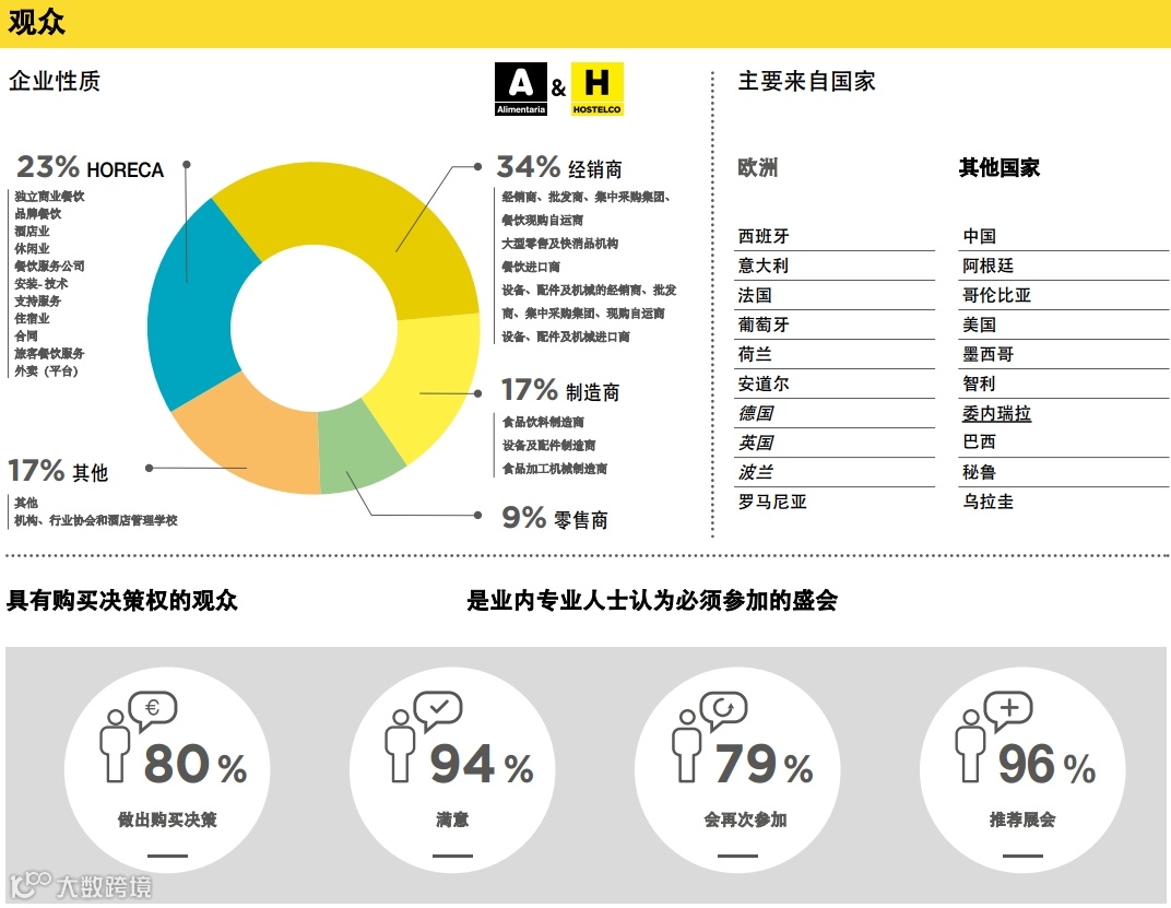 巴塞罗那酒店用品展(Hostelco)与巴塞罗那食品展Alimentaria同期举办,上届展会吸引了来自68个国家的3200多家企业参展。约有107,900名专业人士参观了展会,其中25%是来自120个国家的国际人士。本次展览净展览面积达10万平方米,几乎占据了巴塞罗那展览中心大大道展馆的整个空间。巴塞罗那酒店用品展(Hostelco)再次成为参展企业的国际性战略盛会,以意大利企业为首的900多家国际企业参展,亚洲企业的回归也引人注目,尤其是来自中国、韩国和泰国的企业。该展会通过加强其所代表行业的互补性和为专业人士提供良好的商业平台来重申其领导地位。与会者包括来自欧盟、美国和拉丁美洲食品和招待设备市场的2,200名主要买家。