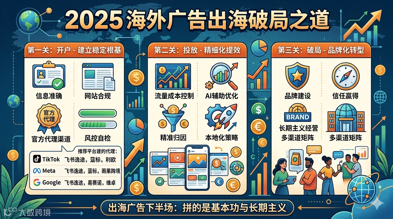 对于国内出海商家来说,海外广告投放早已从过去“买量就能赢”的粗放阶段,进入了一场必须步步为营的“生死局”。从账户还没开出来就被拒,到好不容易跑起来却因为合规问题被封,再到投了钱却看不到效果,每一步都可能是悬崖。本文将系统梳理出海商家最头疼的痛点,并提供切实可行的自救策略。