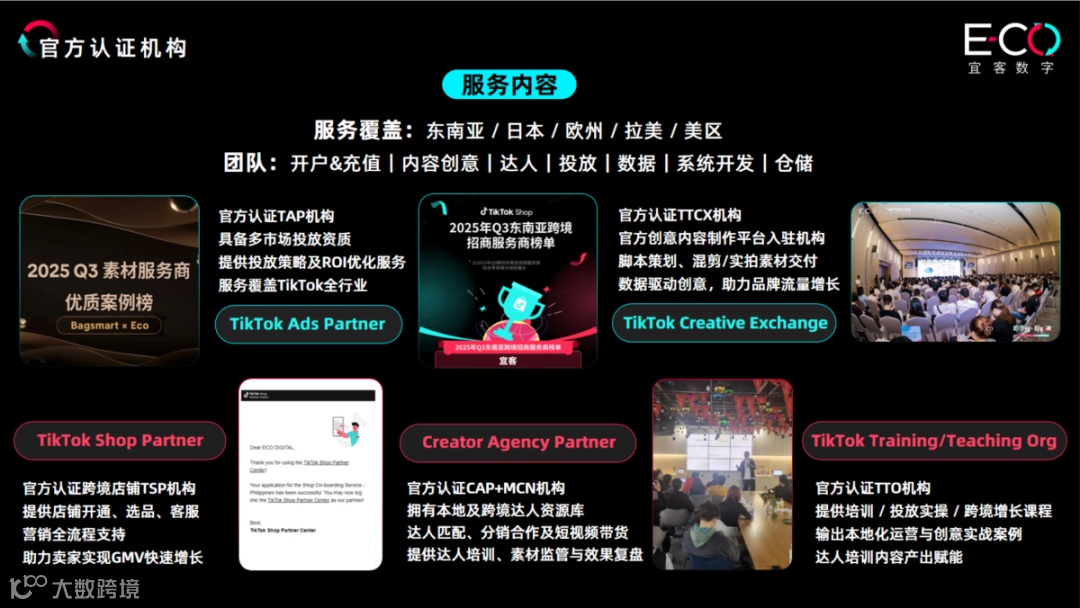 全链路落地支持:覆盖TikTok店铺代运营、询盘24小时响应、衔接外贸报价、合规审核与全球物流履约,形成“内容-流量-转化-交付”闭环。