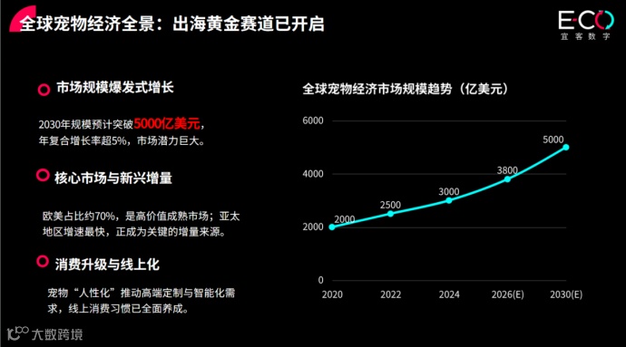 如今,宠物角色已经从“陪伴型动物”升级为“家庭成员”。这种情感转变,让全球宠物经济规模预计在2030年突破5000亿美元。欧美成熟市场稳定增长,东南亚、中东、拉美等新兴市场更是高速爆发。中国宠物企业手握强大的供应链优势——价格比欧美品牌低30%-50%,产能响应快、定制能力强——但长期扮演“隐形制造者”的角色,缺乏品牌认知。
