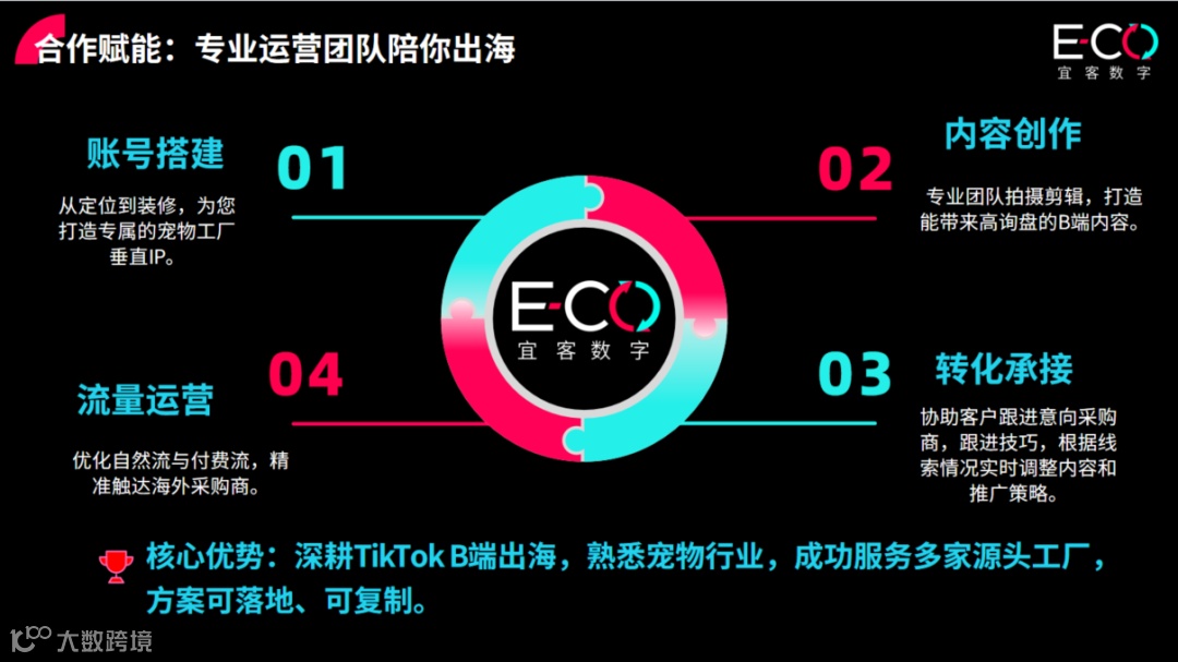 在运营端,我们的差异化策略非常明确:第一,只做B端精准获客,拒绝泛娱乐流量,内容与投放全部面向海外采购商;第二,运营+外贸一体化,衔接询盘、报价、物流等全环节,真正解决“有流量无订单”痛点;第三,轻资产、快落地,7天建账号、1-2周出询盘,方案可复制、效果可量化,让宠物品牌低成本高效出海。