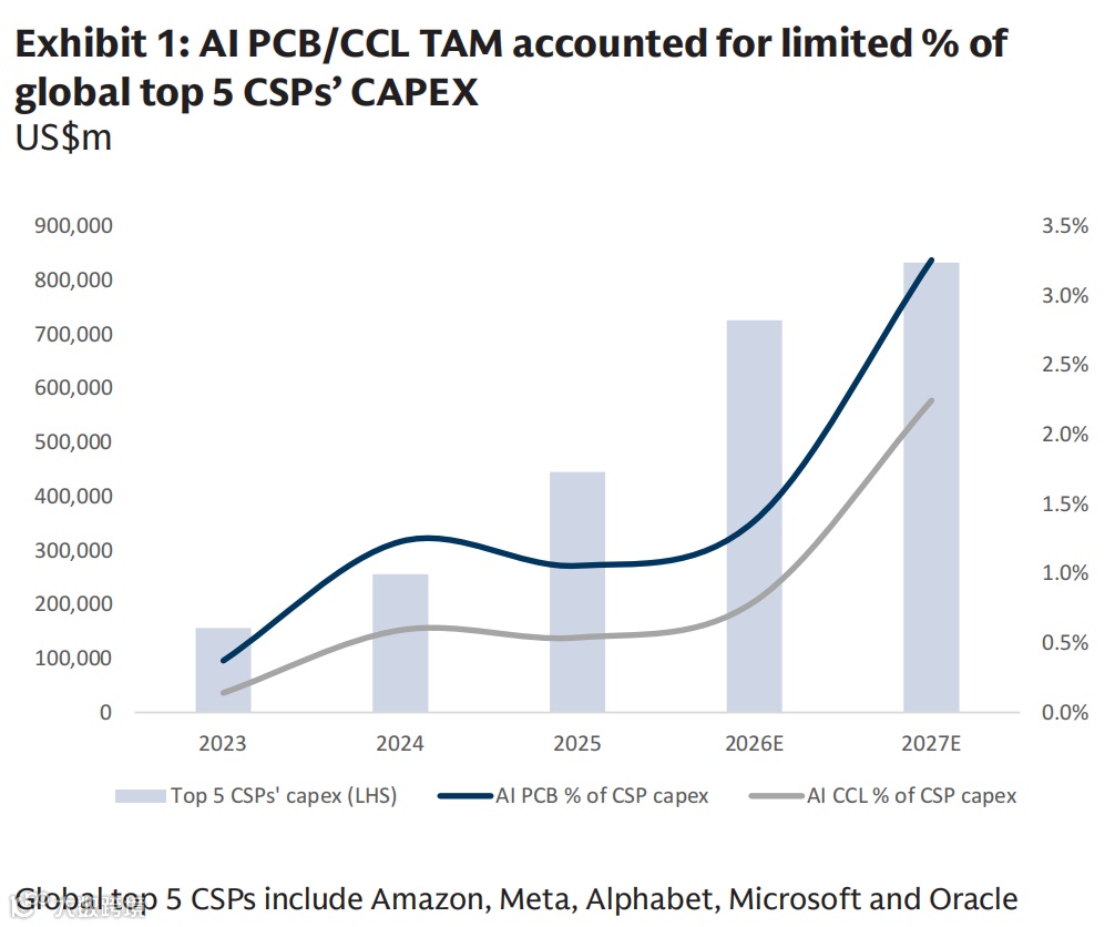 同时高盛测算显示,过去三年,AI 相关 PCB、覆铜板的市场规模(TAM)仅占全球前五云服务商资本开支的 0.1%-1.2%;高盛预计 2026 年该比例将分别提升至 PCB 1.4%、覆铜板 0.8%,2027 年进一步升至 PCB 3.3%、覆铜板 2.2%。