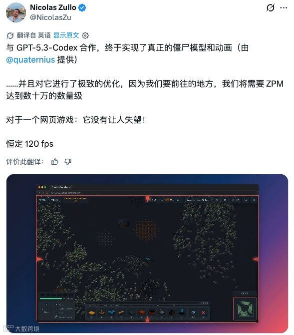 第五步引入美术资产。Quaternius 免费丧尸模型配上 Mixamo 角色动画,Nicolas 让 Codex 在这个基础上做极限性能优化,目标是后期承载十万级实体。最终结果:网页游戏,恒定 120 FPS,MacBook M1 Pro 上 90+ FPS。