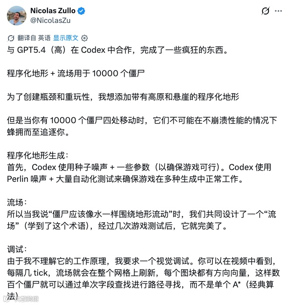 这里还有一个细节值得单独说。Nicolas 让 Codex 同时做了一个可视化调试模式。视频里可以看到方向箭头在整张地图上每几 tick 刷新一次。他自己的解释是"我看不懂流场怎么跑的,所以让它画出来"。